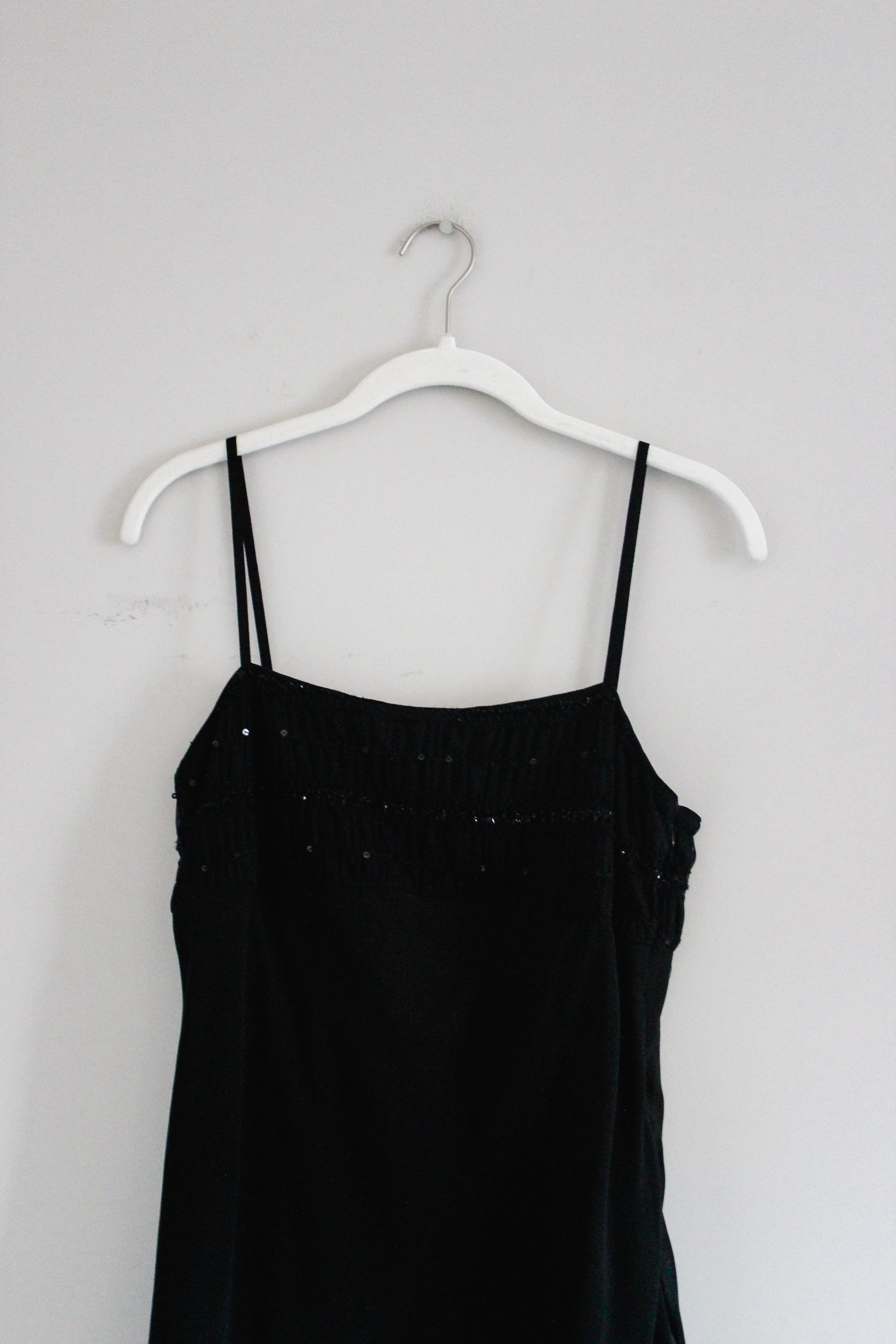 Tagged a size 8 but would best fit a medium. Ruffles down one side. Sequined front.