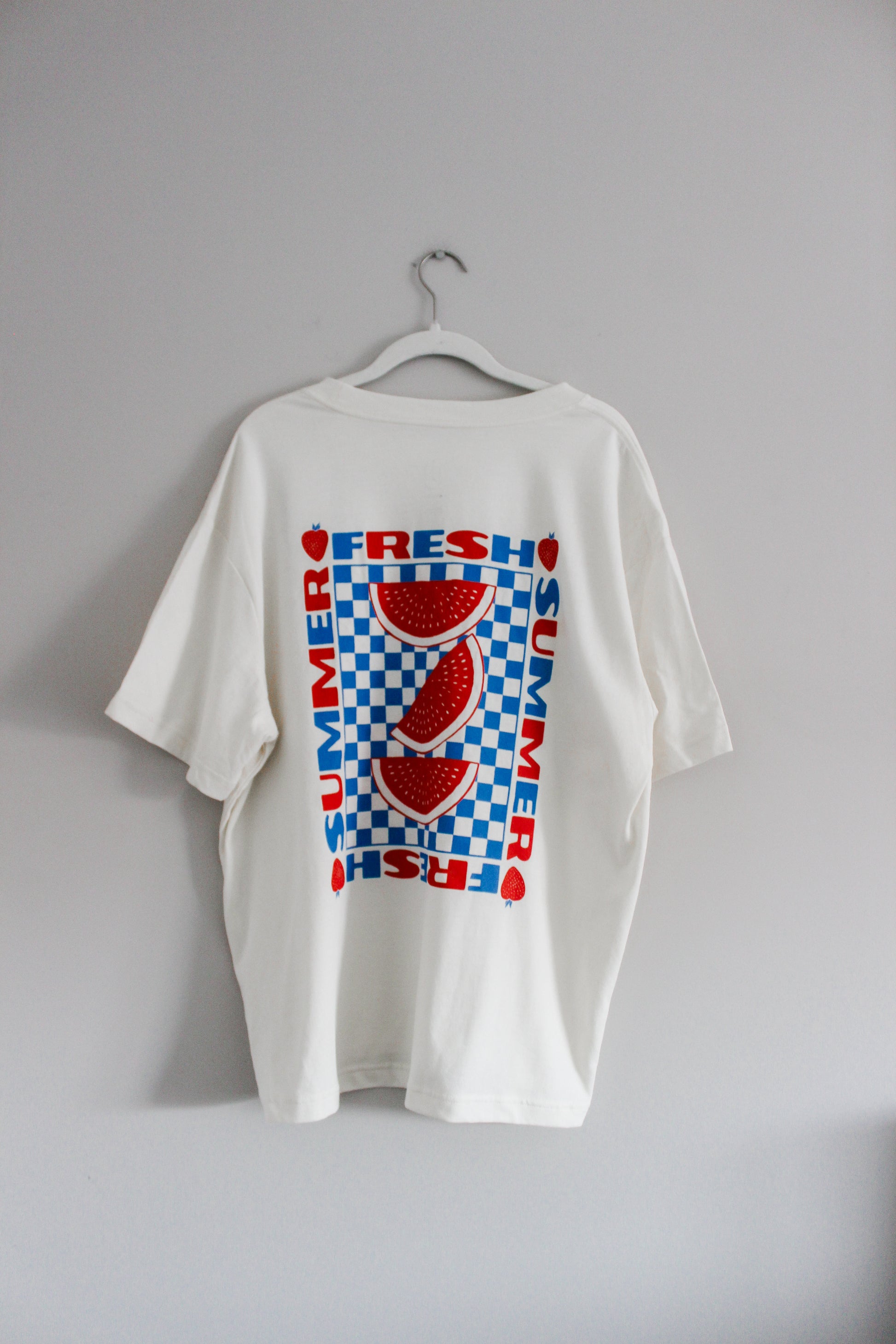 "Fresh summer" watermelon design. ADORABLE! Graphic is on the BACK of the shirt and the front is PLAIN.